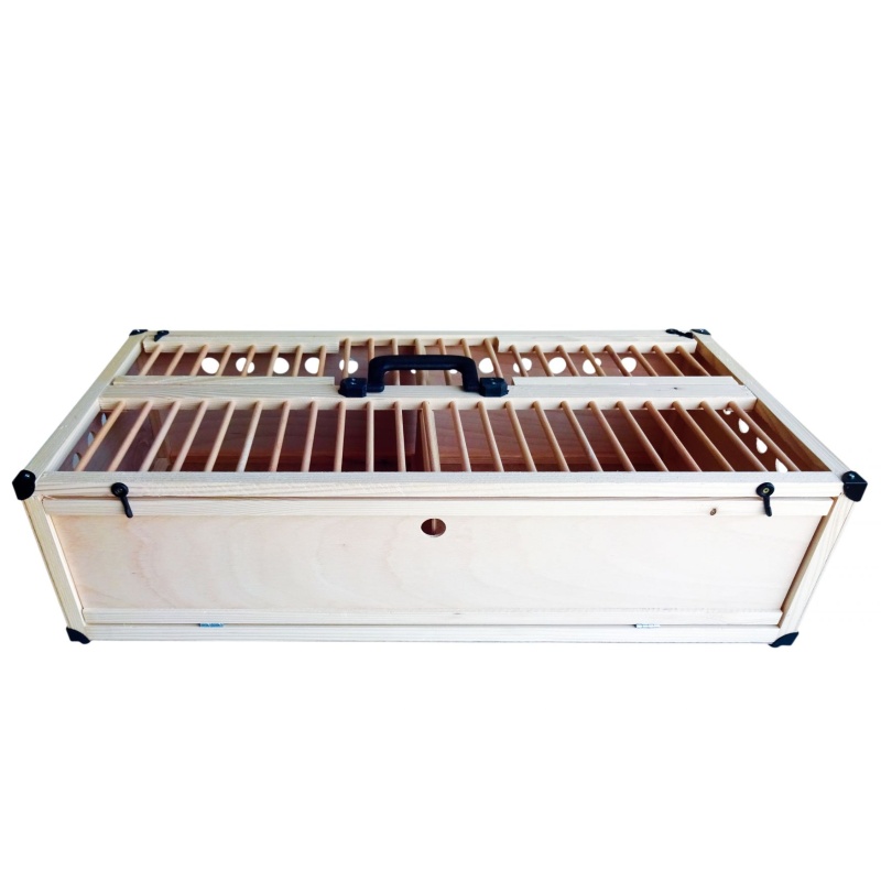 Tento prepravný box STANDARD je ideálnym riešením pre všetkých chovateľov holubov, ktorí potrebujú spoľahlivý a praktický spôsob prepravy svojich holubov. Robustná drevená konštrukcia a premyslený dizajn zaručujú bezpečie, pohodlie a jednoduchú manipuláciu.