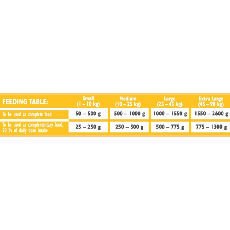 48 % kuracie mäso (mäso a vnútornosti), 22 % hovädzie mäso (mäso a vnútornosti), 3 % hrachový škrob, 1 % hrachová vláknina, 0,5 % lososový olej.