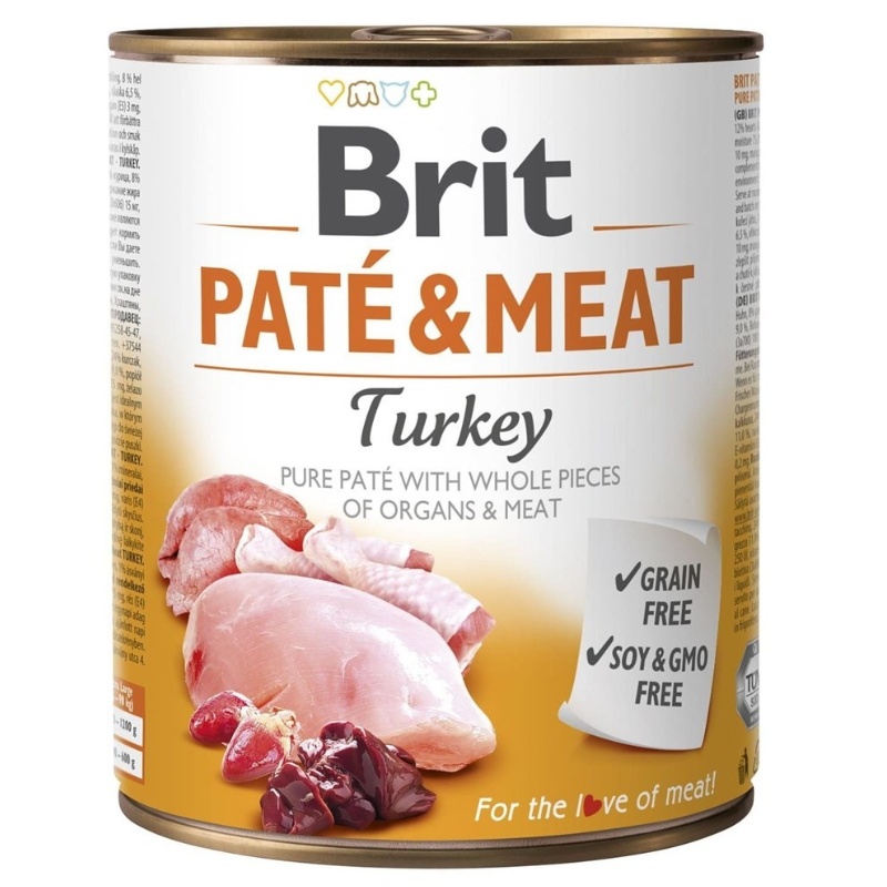 Prémiová mäsová paštéta Brit Paté & Meat Turkey ponúka lahodnú kombináciu morčacieho a kuracieho mäsa doplnenú o pravé kúsky vnútorností. Vysoký podiel kvalitného mäsa a šetrná výroba zabezpečujú prirodzenú arómu, výbornú chuť a vysokú stráviteľnosť. Jemná paštétová konzistencia je ideálna ako kompletné krmivo aj ako chutný doplnok ku granulám – pomáha zlepšiť príjem potravy a zároveň podporuje hydratáciu. Receptúra je bez obilnín, sóje a GMO, vhodná aj pre citlivejších psov.