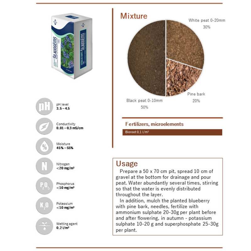 Substrát špeciálne vytvorený pre pestovanie čučoriedok, brusníc a ďalších kyslomilných rastlín. Vyrobený je z hnedej a čiernej rašeliny, drevného koreňa a píniovej kôry, ktoré zabezpečujú optimálne kyslé prostredie a výborné podmienky pre rast a zakoreňovanie. Obohatený o základné organické látky a živiny.