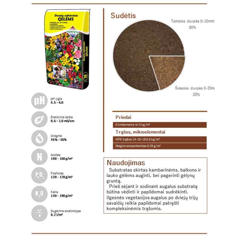 Univerzálny kvetinový substrát je určený na pestovanie izbových, balkónových, poľných aj záhradných kvetov. Je vhodný na výsadbu a presádzanie rôznych druhov okrasných rastlín. Vďaka strednej frakcii poskytuje rastlinám ideálne podmienky pre rast, optimálne prevzdušnenie koreňov a rovnomerné zadržiavanie vlahy.