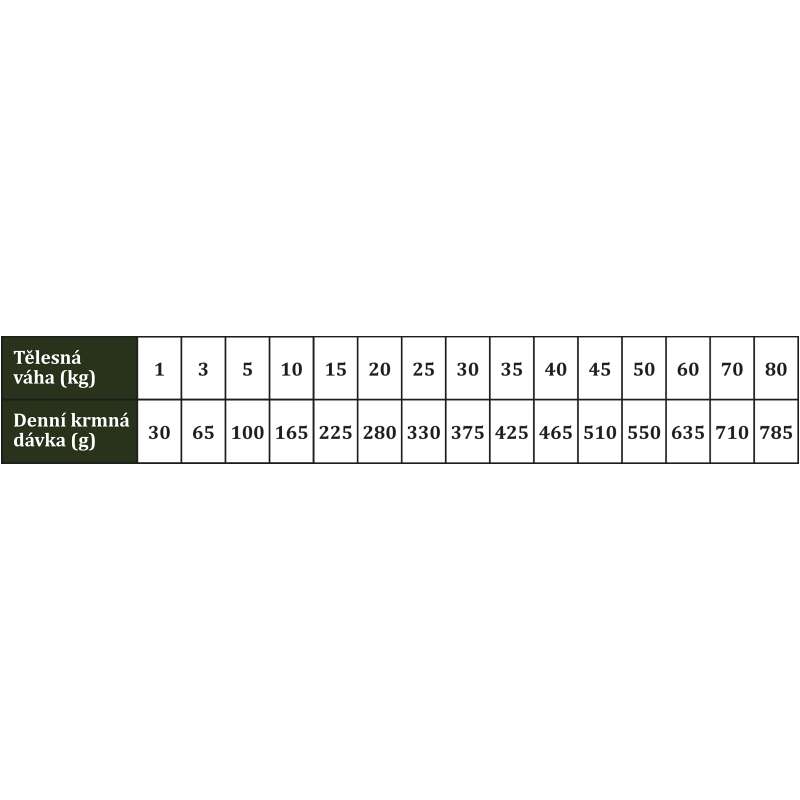 Dennú dávku prispôsobte veku, plemenu, telesnej stavbe a aktivite psa. Odporúča sa rozdeliť ju do 1–2 porcií denne. Pri prechode na nové krmivo miešajte postupne počas 7–10 dní. Pes musí mať vždy k dispozícii dostatok čerstvej pitnej vody.
