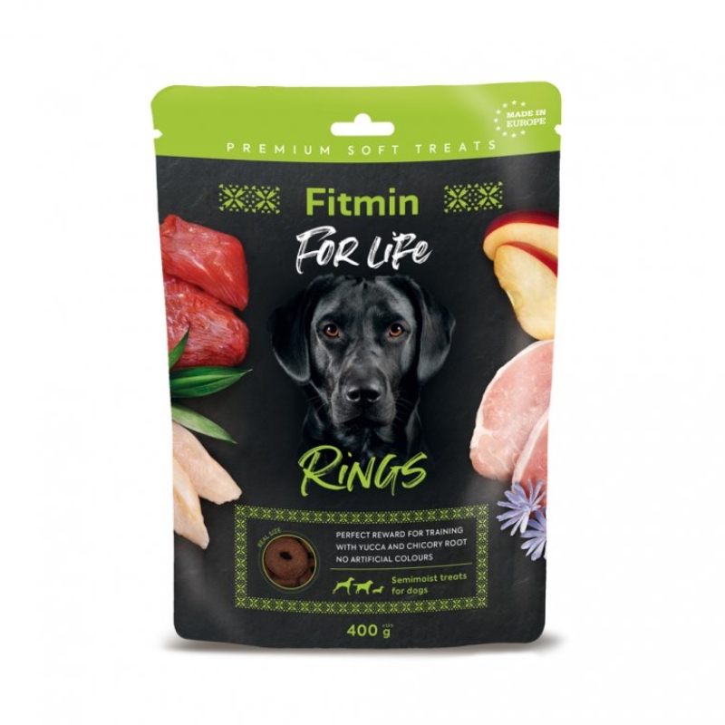 Fitmin For Life Rings sú mäsové maškrty v tvare polomäkkých krúžkov, ktoré sú vhodné pre všetkých psov od šiestich mesiacov veku. Tieto pochúťky možno podávať buď celé alebo ľahko nalámať na menšie kúsky.