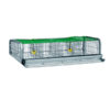 Súčasťou klietky je vonkajšie dlhý závesný žľab na krmivo a automatické napájačky pre každý oddiel. Klietka je v demonte.