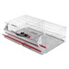 Stredná klietka určená pre chov japonských prepelíc, vhodná pre 20 až 30 zvierat. Klietka je rozdelená na dva oddiely, čo umožňuje jednoduchú správu vtákov a oddelenie podľa veku alebo pohlavia. Sklopený rošt so žliabkom uľahčuje zber vajec bez rušenia zvierat. Klietka obsahuje vonkajší závesný žľab na krmivo a automatické napájačky pre každý oddiel, čo zabezpečuje pohodlný a hygienický chov.