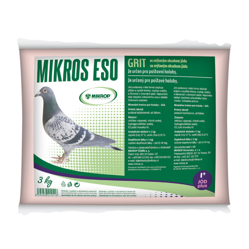 MIKROS ESO grit so zvýšeným obsahom jódu pre poštové holuby, určený pre podporu trávenia, zlepšuje príjem a využitie krmiva, zvyšuje znášku a liahnivosť u chovných párov, napomáha tiež zlepšenie zdravotného stavu mláďat.