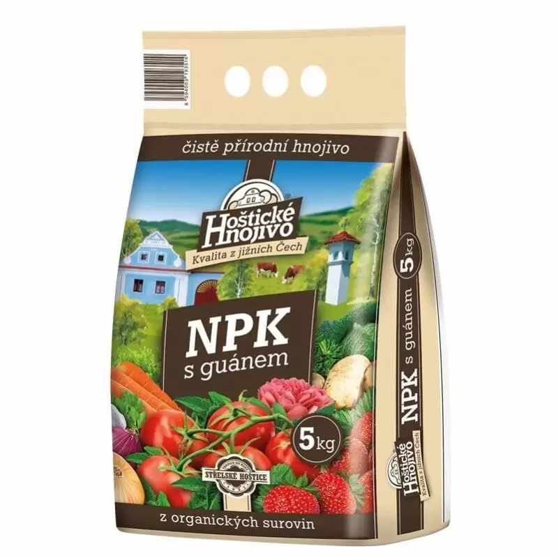 Hoštické NPK je čisto prírodné hnojivo bez prídavku priemyselne vyrábaných zložiek. Hnojivo obsahuje popri základnom NPK aj prírodné guáno z trusu morských vtákov a dalšie stopové prvky. Je vhodné nielen pre univerzálne použiti v celej záhrade ale hlavne pre zdravú Výživu ovocia a zeleniny. Veľmi vhodné aj na základné hnojenie pôdy na jeseň alebo na jar. Prírodné organické hnojivo 5% N + 2% P2O5 + 8% K2O Použitie: Aplikuje se na jar alebo na jeseň na povrch pôdy rozhodením a miernym zapravením. Následne sa dostatočne zavlaží. Pri aplikácii do nádob sa premieša so substrátom. Pri následných aplikáciach sa rozsype okolo rastlín, mierne zapraví a zavlaží.