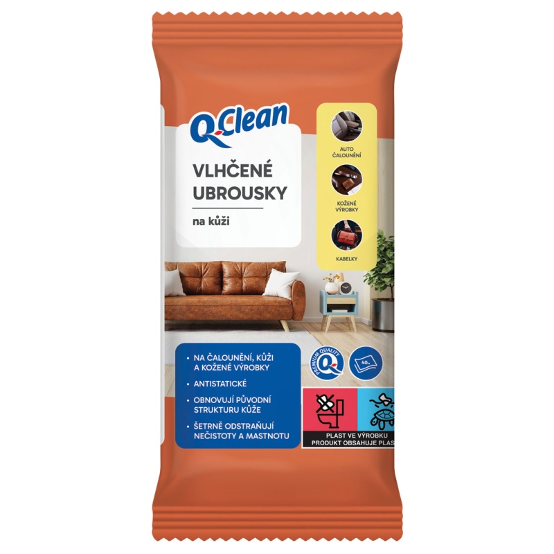 Vlhčené obrúsky Q-Clean sú určené na čistenie a starostlivosť o kožený nábytok a výrobky z kože. Vďaka špeciálnemu zloženiu účinne odstraňujú nečistoty a zároveň pomáhajú chrániť kožu pred degradáciou spôsobenou slnečným žiarením.