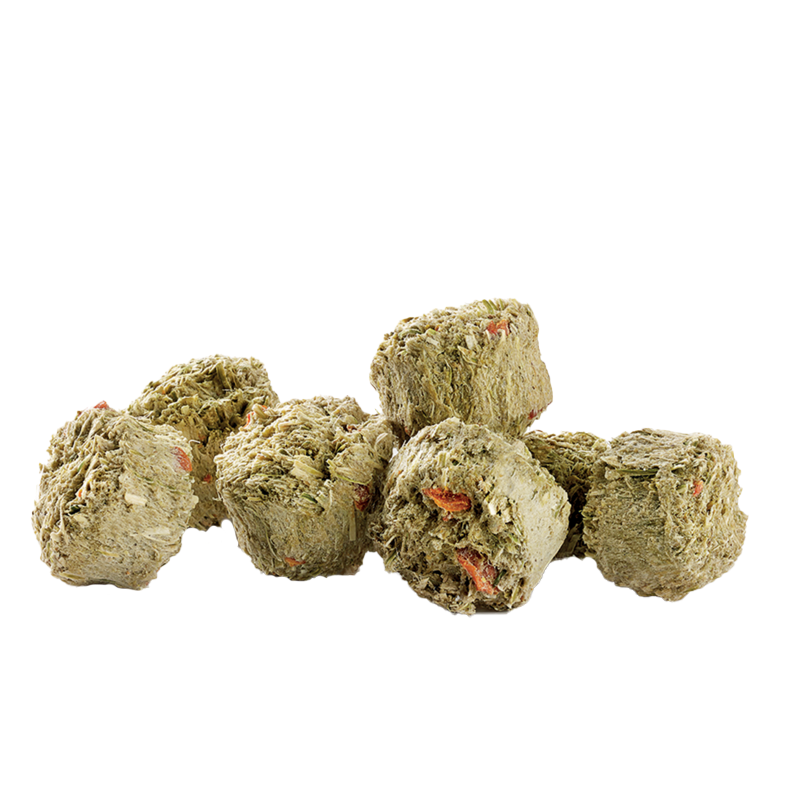 Chutná a chrumkavá maškrta pre králiky a drobné hlodavce. Ľahké kocky so senom a zeleninou sú ideálne ako malé spestrenie jedálnička. Vďaka baleniu Freshpack zostávajú dlho čerstvé a chrumkavé. Obsahujú veľa vlákniny, ktorá pomáha tráveniu a podporuje prirodzené obrusovanie zúbkov.