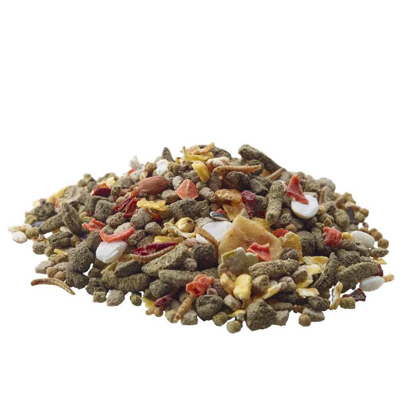 Zrná (kukurica 17 %), deriváty rastlinného pôvodu, zelenina (hrášok 12 %, paprika 2 %, mrkva 2 %), semená, ovocie (banán 1 %, hrozienka 1 %), rastlinné bielkovinové výťažky, hmyz (múčne červy 4 %), orechy, minerálne látky, droždie, byliny, oleje a tuky, nechtík, FOS, MOS, hroznové semeno, riasy, juka.